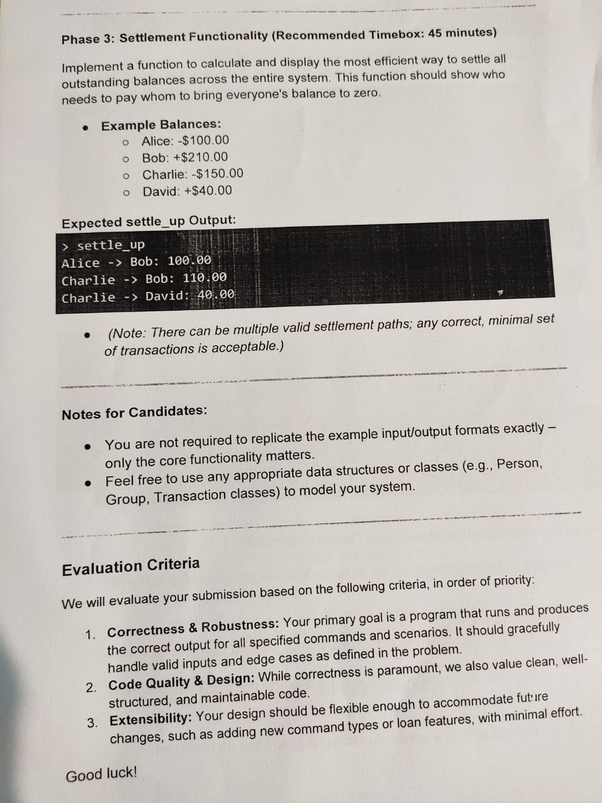 The solution should focus on back-end logic; no front-end or database implementation is required.